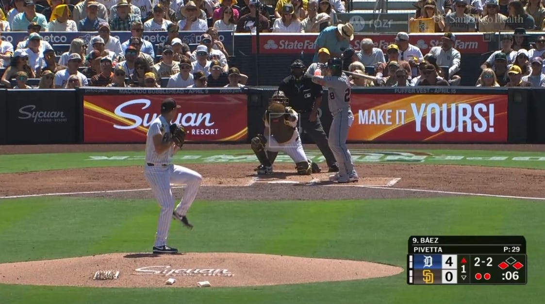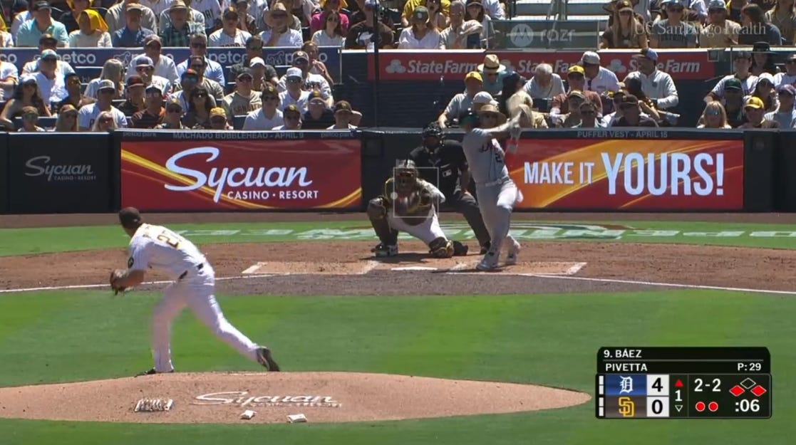 Pivetta didn’t give up a ton of hard contact on the day and certainly got unlucky in the sequencing of several weakly hit balls, but the command issues were very real. When he located his pitches he was effective. The Tigers weren’t really squaring him up. Four of the base hits that led to the scoring had weak exit velocities of 66.5 MPH, 70.4 MPH, 79.9 MPH, and 89.9 MPH. The two hard hits that led to scoring had EVs of 97 MPH and 105.9 MPH, the latter being the only truly sublime contact the Tigers made against him. But the walks in the first inning were untenable, and were the product of poor command rather than the hitters’ plate discipline. On the day Pivetta had only a 21.2% strike-zone percentage for his 4-seamer, very uncharacteristic after averaging 55.4% a season ago.