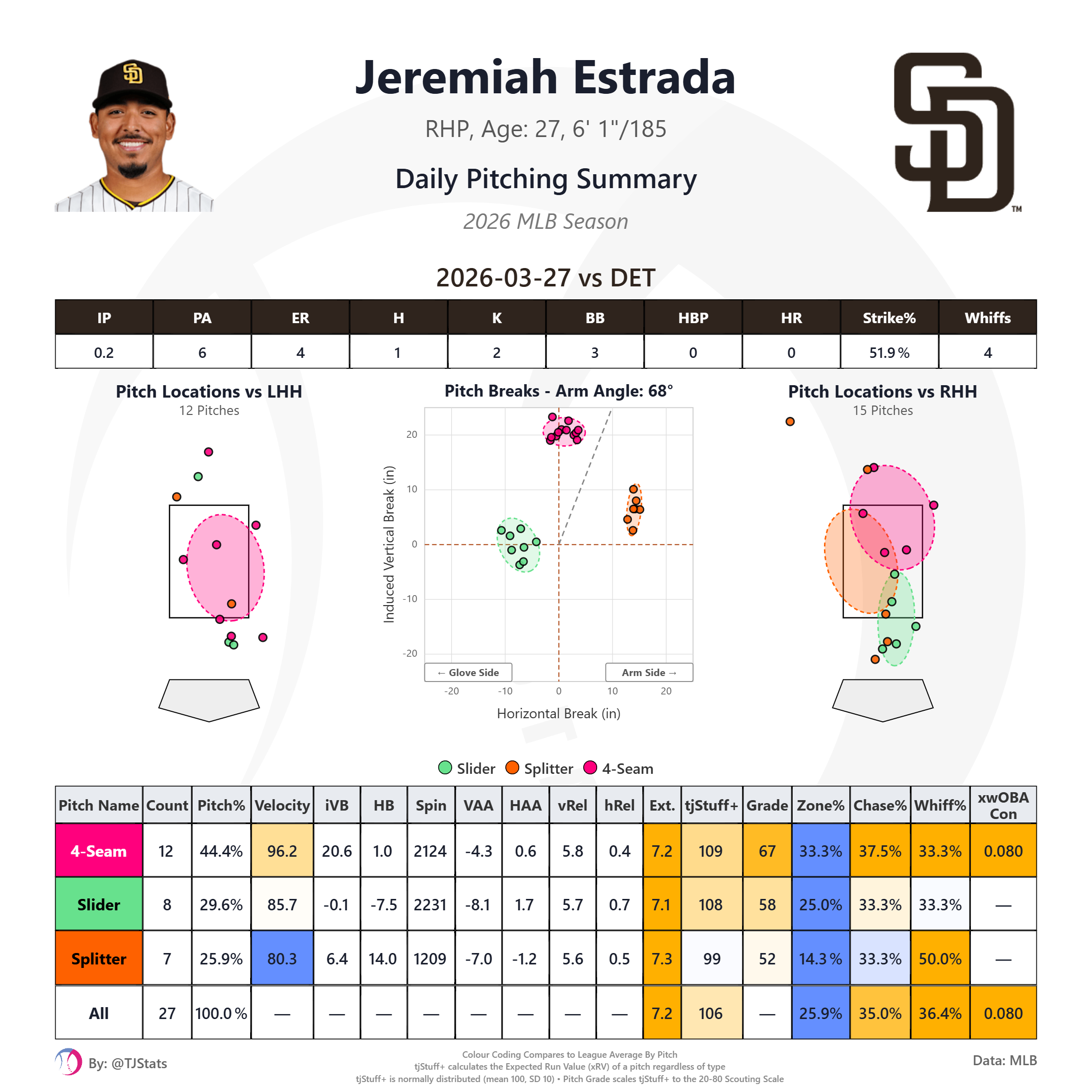 This was Estrada’s worst outing of his Padres tenure, but it was entirely of his own doing. In the end he faced six hitters, struck out two, walked three, and gave up the squibbed infield single to Greene. And while his final pitch of the outing had elite shape, it’s notable that his fastball velocity averaged 96.2 MPH and topped out at 96.9 MPH after averaging 97.9 MPH last season. His slider and splitter velocities were also about 3 MPH below his 2025 averages: