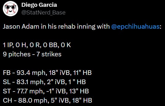 The Padres look to have a very deep bullpen, especially with Jason Adam making a minor league rehab start this week and his pitch shapes and velocity looking healthy: