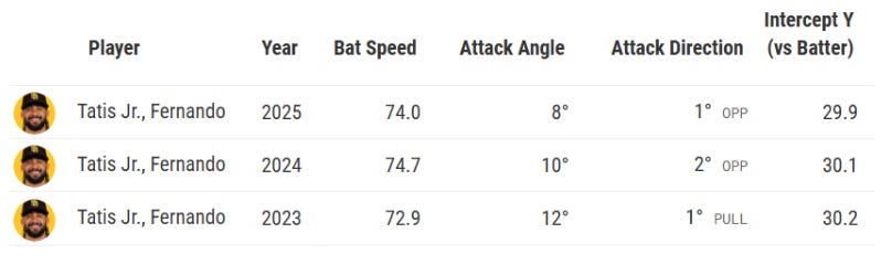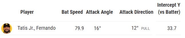 This is the swing that Tatis should be taking nearly every time when there are less than two strikes, and depending on the game situation, often even with two strikes. The bat speed is elite, and the attack angle is a fly ball oriented bat path. The pull-side attack direction and Y intercept of 33.7 inches (how far out in front of the plate the bat intercepts the ball) are optimized for power hitting. Tatis is fresh off the WBC in which he showed he still has light-tower power: