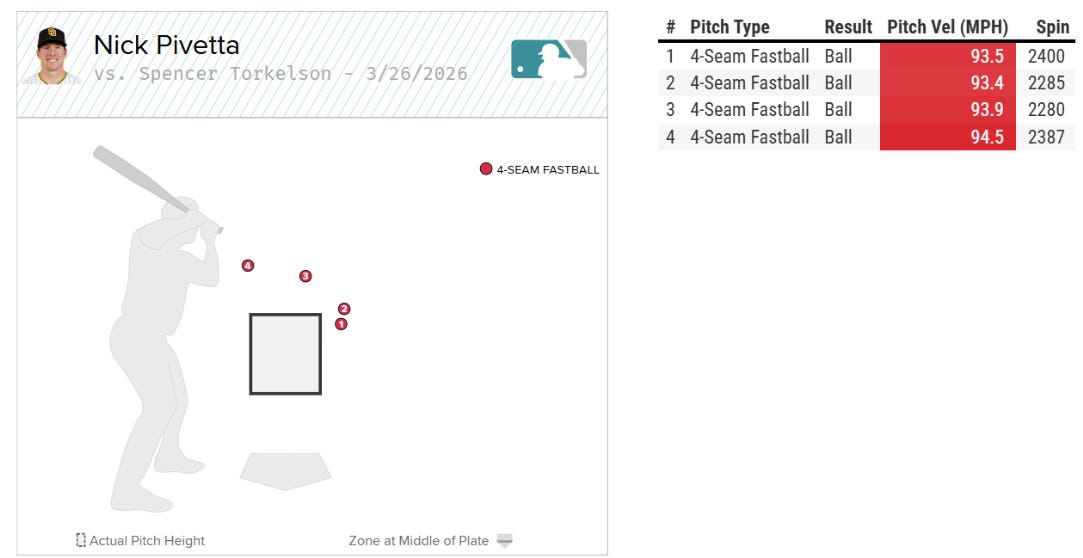 Nick Pivetta faced off against reigning back-to-back Cy Young winner Tarik Skubal. Pivetta started the season off with a strikeout of Kerry Carpenter on three perfectly executed pitches. The first pitch of the season was a 94.3 MPH 4-seam fastball with 21 inches of induced vertical break (iVB) at the top of the zone. This is the key pitch that led Pivetta to 6th in Cy Young voting in 2025. The iVB creates so much ride it’s extremely difficult for hitters to square up in the top of the zone, even when they’re sitting on it as it appeared Carpenter was. Carpenter would foul off two well located 4-seamers up and in before Pivetta buried him with a 2700 RPM curveball that dropped 61 inches on the way to the plate thanks to an absurd -18 inches of iVB.