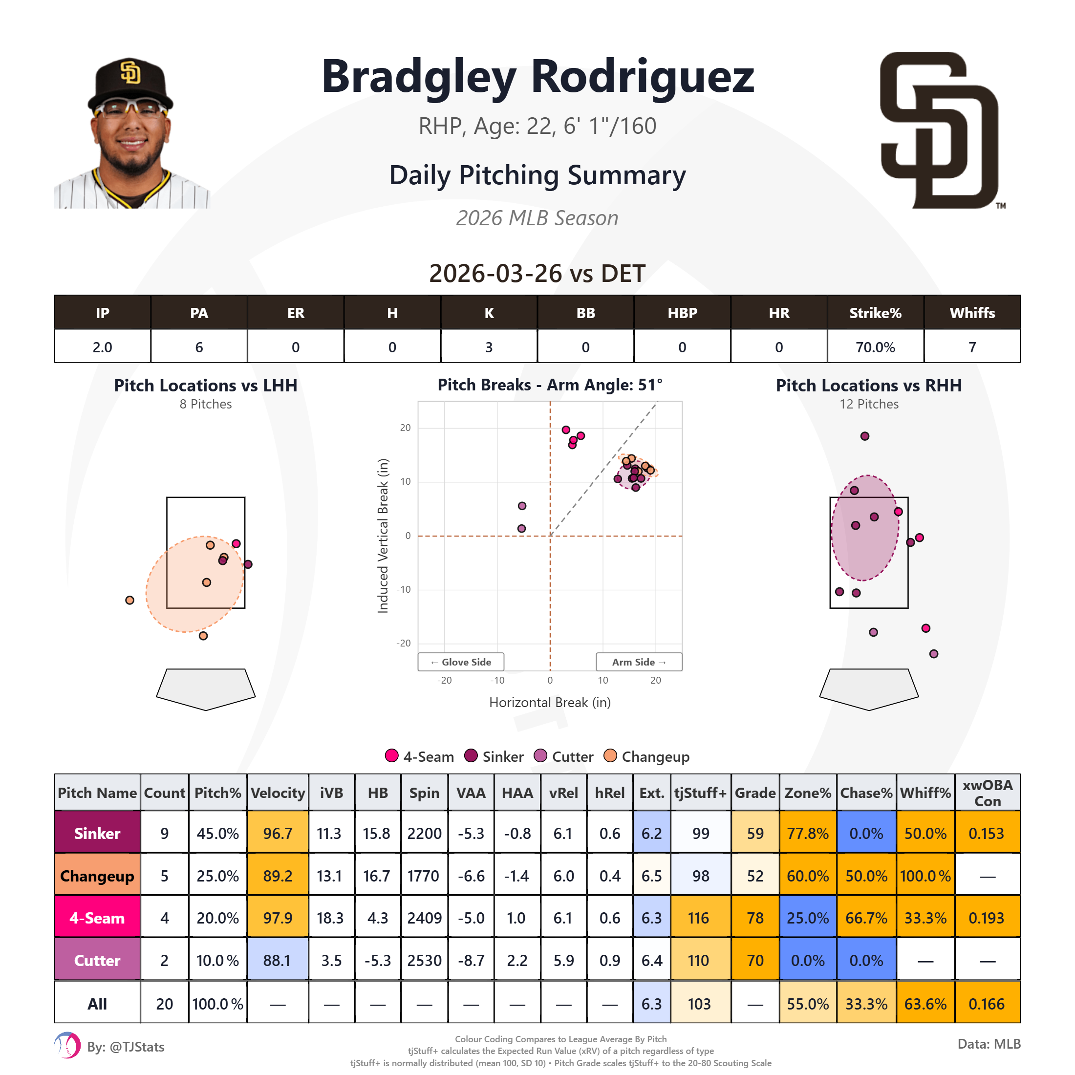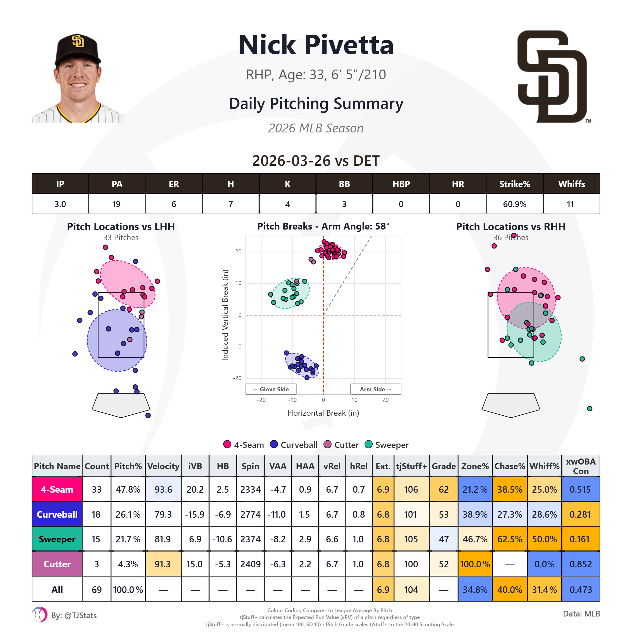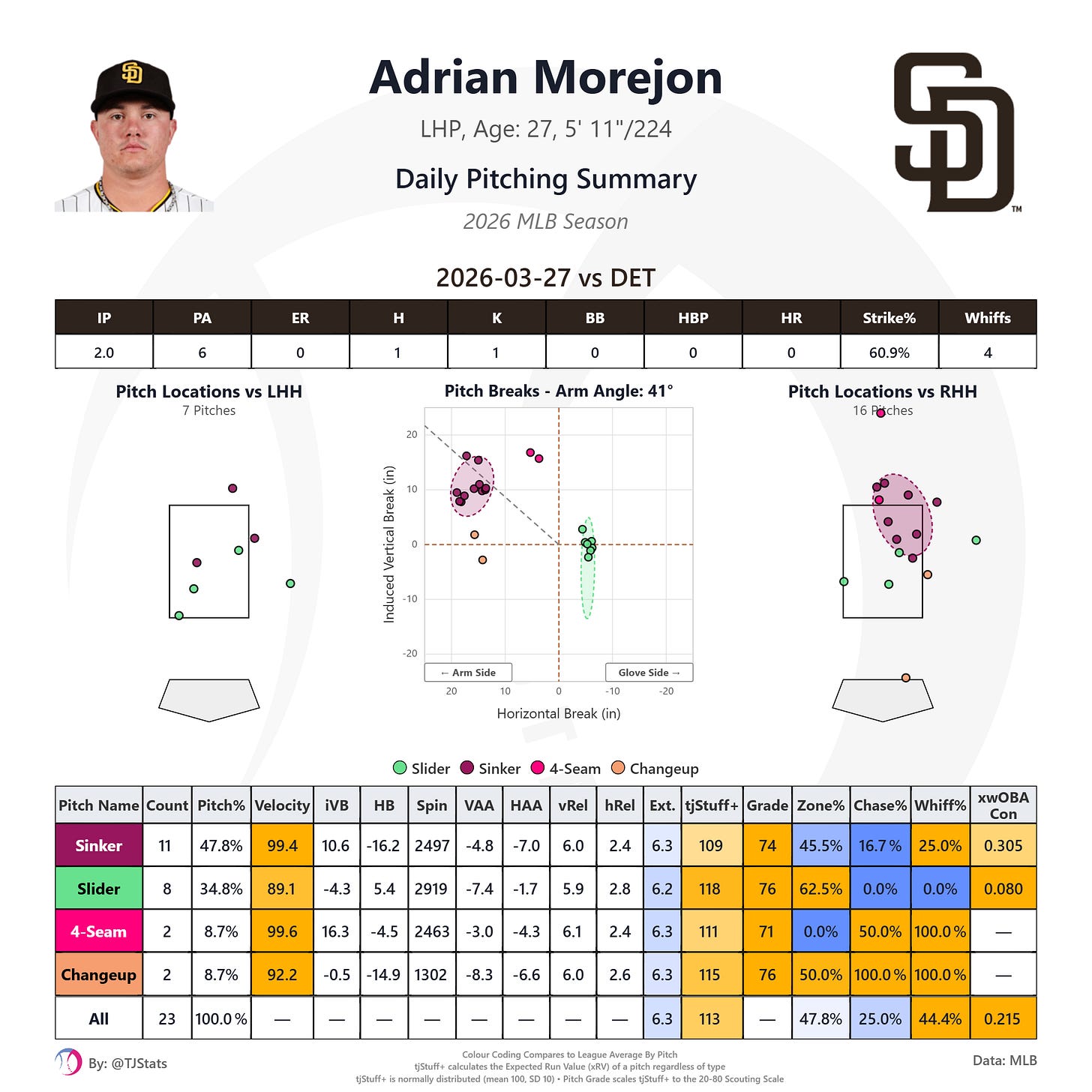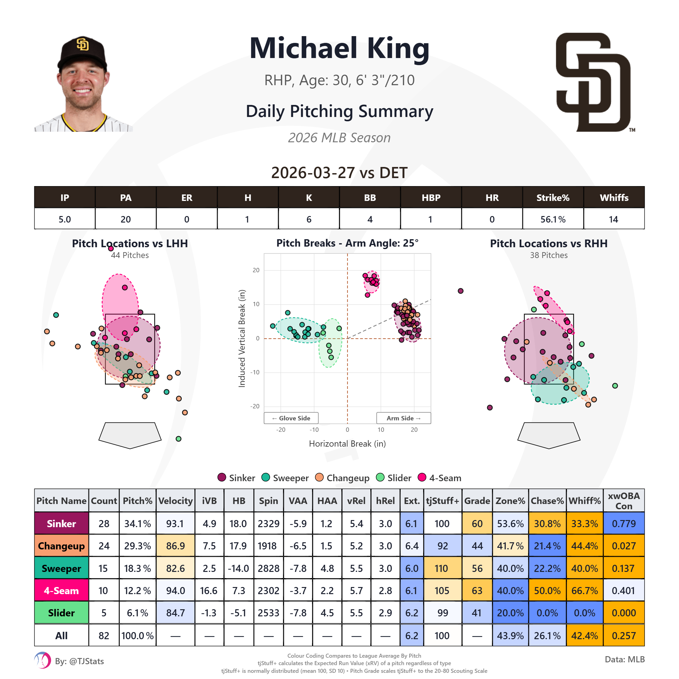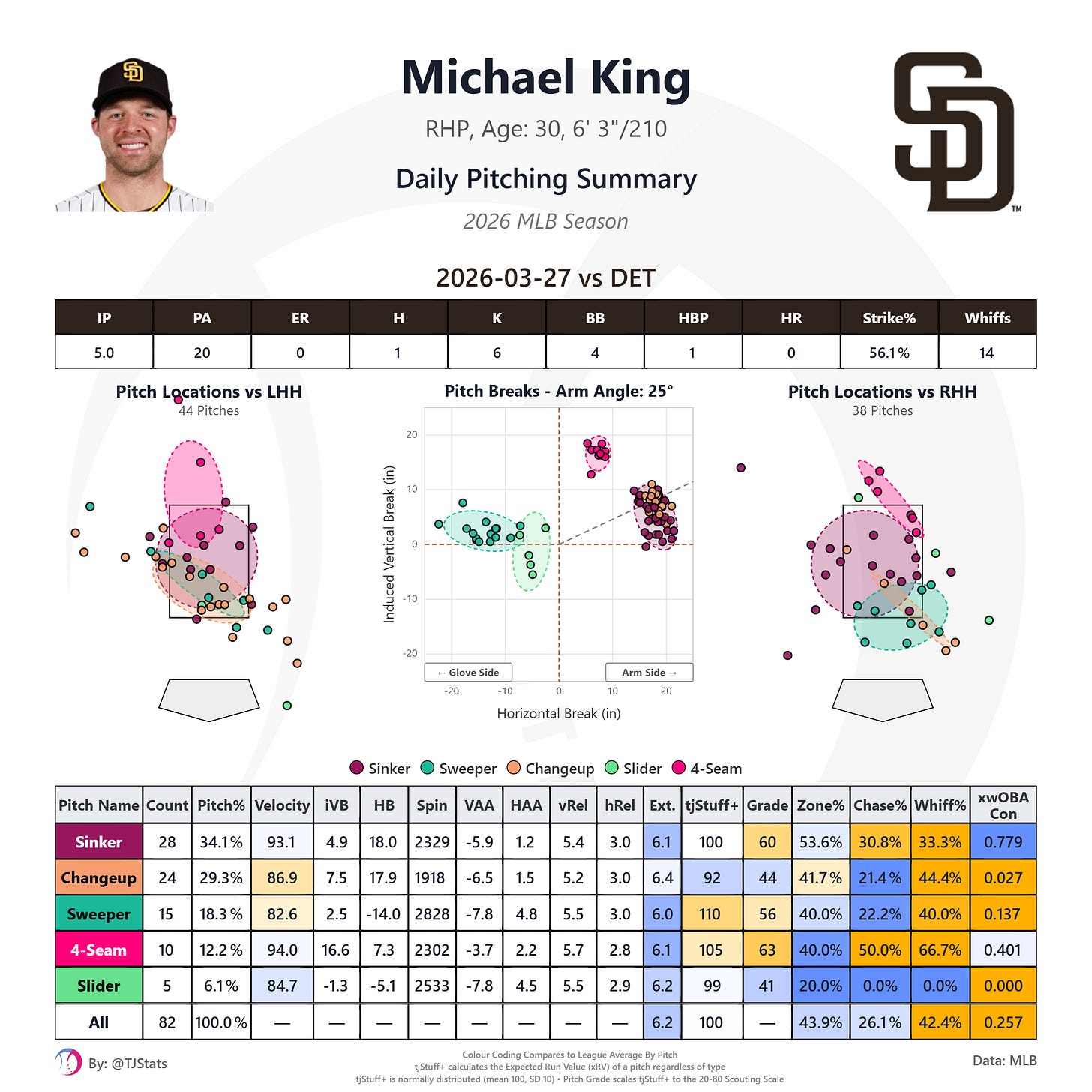 Michael King took the mound in game two facing off against another formidable Tigers lefty Framber Valdez. We wrote about King’s pitch shapes in spring training. Although his velocities were right in line with 2025, the movement on his pitches, especially the horizontal break, had been slightly behind his 2025 season averages, including in his final spring start just over a week ago. One possible explanation for the decreased movement could have been the different atmospherics in the desert confines of Peoria, and indeed in King’s first start at Petco the break on his pitches was much closer to what he’d shown in 2025: