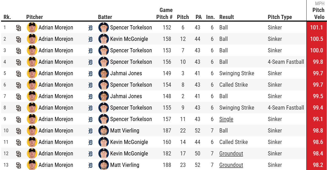 Adrian Morejon came in to relieve King, making his first appearance of the season. And Morejon showed something new. In 2025 Morejon averaged 97.7 MPH on his sinker and 96.5 MPH on his 4-seam fastball. His first sinker of the night to Jahmai Jones was 99.5 MPH. His first 4-seamer was 99.4 MPH. And he would dial up the velocity from there. Morejon ended up throwing the 13 fastest pitches of the night. He reached a max of 101.1 MPH with his sinker and 99.8 MPH with his 4-seamer: