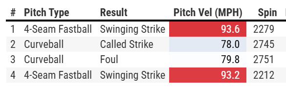 Pivetta’s pitch shapes are so elite that he doesn’t need to blow hitters away with velocity, even at the slower speed and lower spin rates he still achieved over 19 inches of iVB on both 4-seamers and located them perfectly to have the intended effect.