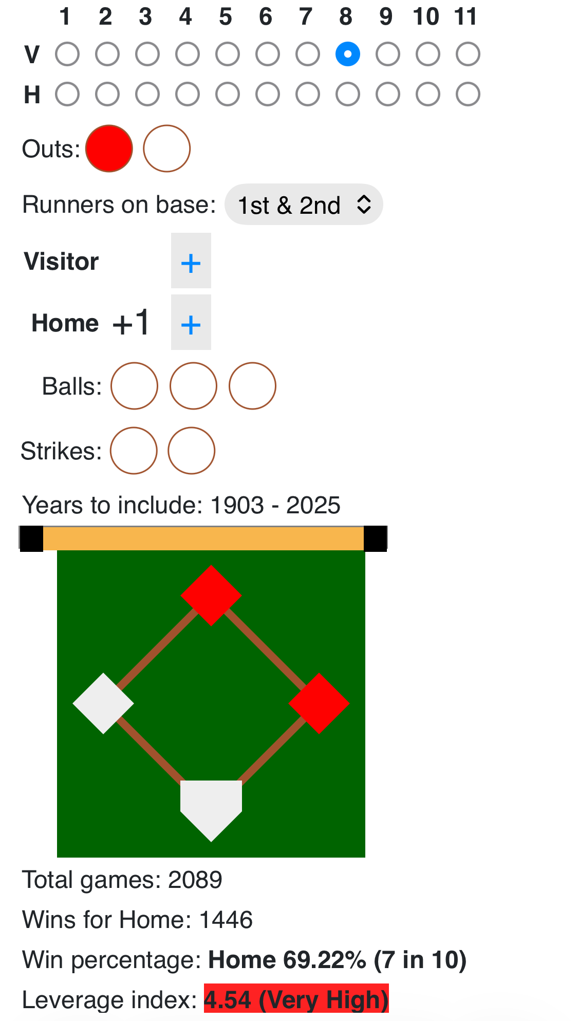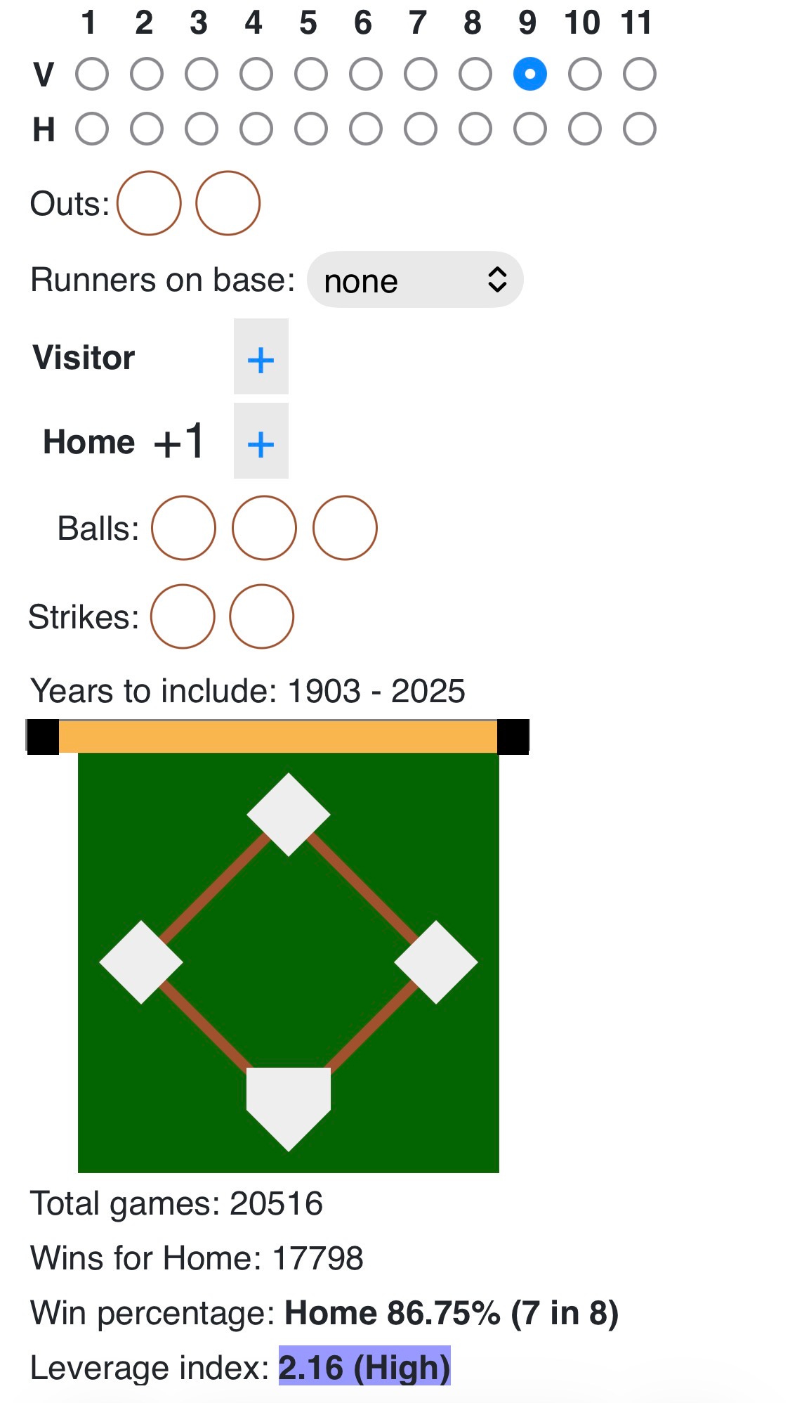 For comparison the highest leverage a closer starting the top of the 9th inning in a save situation can face is 2.16, still high but significantly lower leverage than the 8th inning situation above: