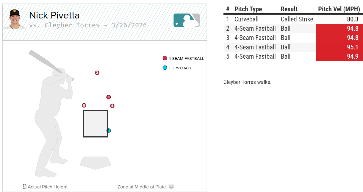 Gleyber Torres saw an inverted pitch mix with a curveball that Pivetta located well to start the at bat, but he missed wildly with his 4-seam on the second pitch. He would fire off three more 4-seamers that each inched closer to the zone, but each missed, and Torres didn’t offer at any drawing the walk: