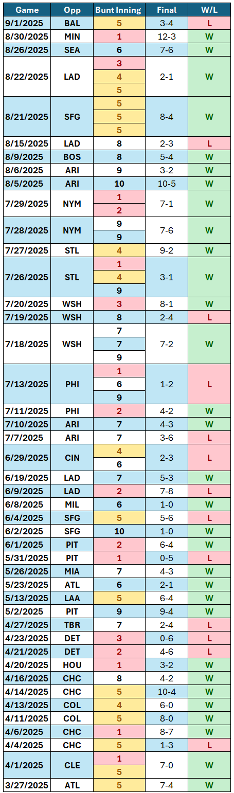 Games with multiple bunts will be double counted on this chart, there’s no clean way around it; but the overall record of 31-13 in games with at least one sac bunt represents 44 distinct games.