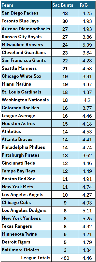 The sacrifice bunt has become one of the most loathed plays in the sport because of the irrefutable observation that it decreases expected run scoring. And that’s been a well-founded source of consternation from Padres fans watching an offense that is near the bottom of the league in runs scored drop sacrifice bunts again and again. Unsurprisingly the Padres lead baseball by a wide margin in sacrifice bunts: