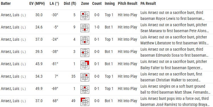 Luis Arraez has attempted a sacrifice bunt to move Fernando Tatis Jr to 2nd base all eight times. And beyond the uncertainty present so early in the game, these are all pure downside sac bunts where both the run expectancy and the run distribution move to less favorable states: