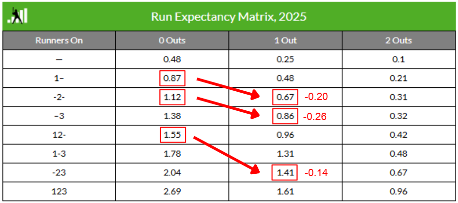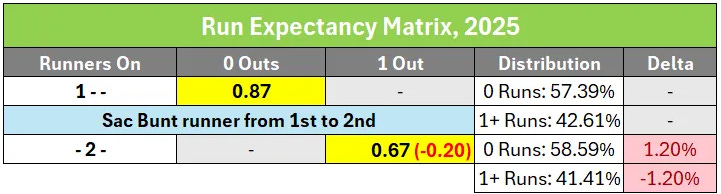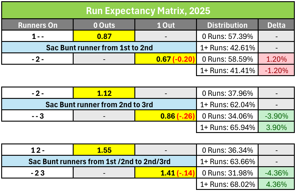 It’s been almost 25 years since analytics swept away a century of received wisdom about the use of bunts, and correctly identified that the use of the sacrifice bunt always carries a decreased run expectancy. This is easy to visualize using the run expectancy matrix (which Fangraphs updated through the 2025 season) to map before-and-after base/out state changes created by sacrifice bunts: