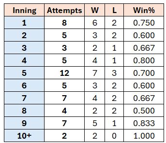 The 9th inning or later is when the team has the most information to use to make a sound small ball calculus, and they’ve gone 7-1 when bunting in these late innings. Results are a lot more mixed when they’ve bunted earlier, though they still have a 24-12 record in those games (.667 winning percentage).