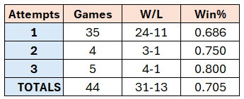 They’ve gone 31-13 in games in which they’ve attempted a sacrifice bunt. And they’ve accrued their best record in games in which they’ve attempted three sac bunts (albeit small sample sizes):