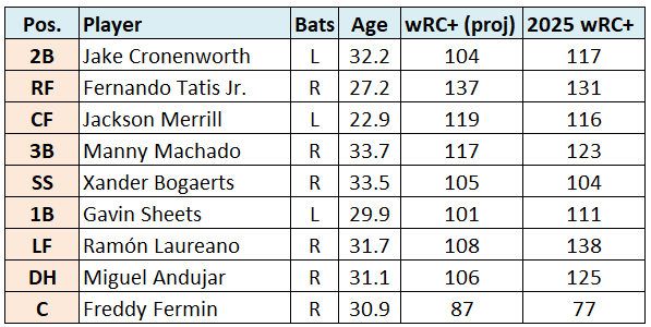 That is a lineup with just enough offensive firepower and defensive chops to be competitive in a playoff race. Fernando Tatis Jr. and Jackson Merrill both have the potential to exceed their projections, and either doing so would meaningfully increase the chances that the Padres offense is good on the whole.