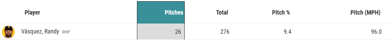 But late last year something started to change. Vasquez was optioned to AAA on August 16th, and when he returned September 6th, he looked like a different pitcher, at least by the pitch metrics. From his return to the Padres September 6th, and through the final five appearances of the season, Vasquez showed legitimate major league fastball velocity with a significant uptick in usage: