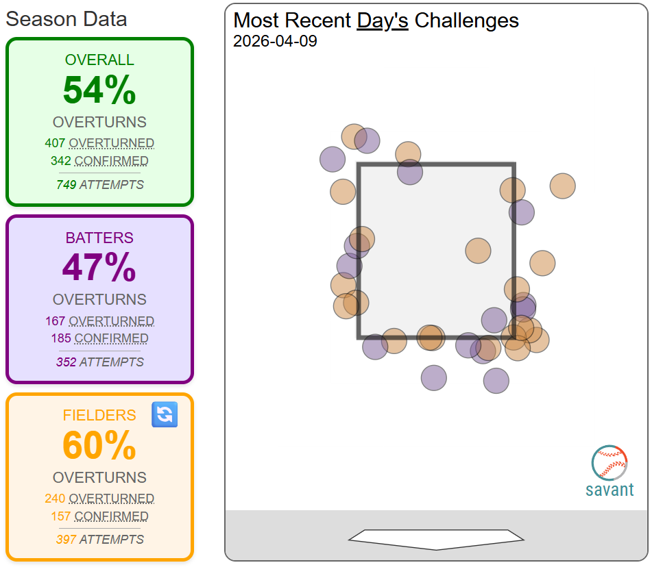 But, in fact, the Padres did have three challenges because each team is awarded an additional challenge in extra innings even if they are not out of challenges when the ninth inning ends. A team should have a much lower confidence threshold to challenge calls if there is high leverage and they have multiple challenges remaining in extra innings. Thus far MLB catchers have had a challenge success rate of ~60%: