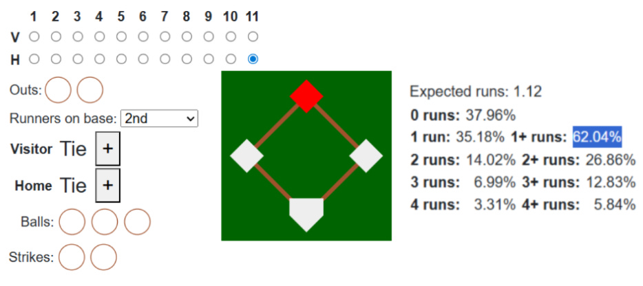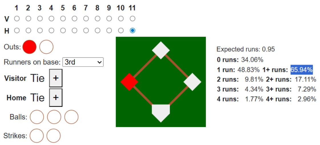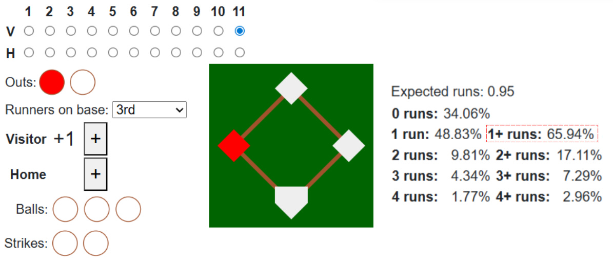 If you’re wondering why both the Rockies and the Padres kept sacrifice bunting, it’s because the play actually incrementally increases the chances of winning the game. Sacrifice bunting leads to less offense over the long run, but specifically sacrificing a runner from 2nd to 3rd base with no outs increases the chances of at least one run scoring from 62.04% by swinging away, to 65.94% by executing the sacrifice: