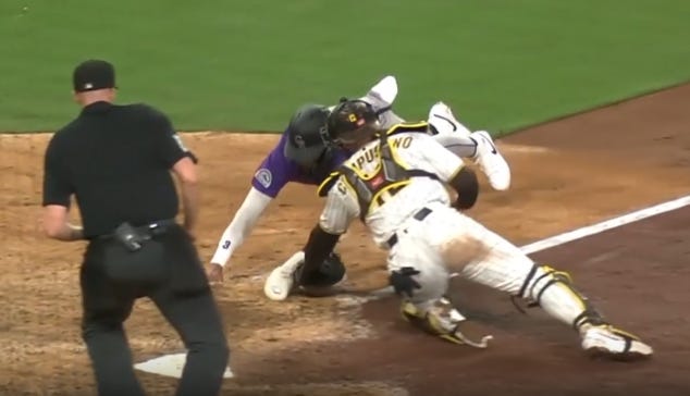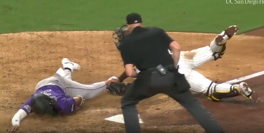 The Rockies now had the go ahead run on third, and Brenton Doyle was once again at the plate. The Padres elected to pitch to Doyle, and brought the entire infield in for perhaps the most fateful play of the game. Doyle sent a groundball up the middle against a drawn in Padres infield. With the runner on third breaking for home on contact, Jake Cronenworth fielded the ball cleanly and made the necessary perfect throw to Luis Campusano. Despite the stellar effort of Cronenworth, there was still plenty for Campusano to do. With the runner gunning in from third base, Campusano had one chance to get the tag down and prevent the run from scoring. He couldn’t have done it better: